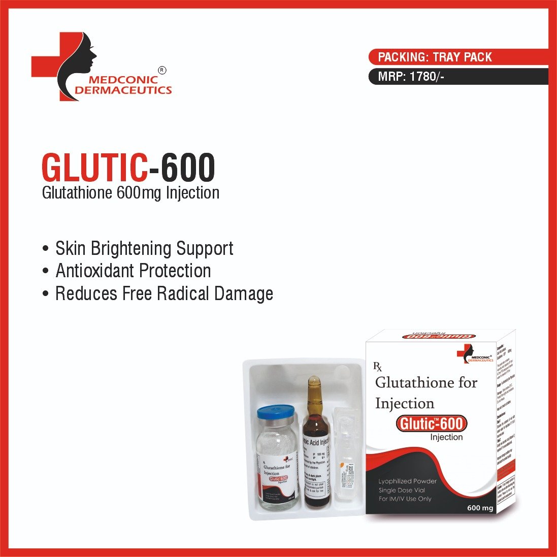 GLUTIC 600 – GLUTATHIONE 600 MG INJECTION is manufactured under strict quality standards to meet medical and pharmaceutical requirements. It is an ideal product choice for dermatology-focused pharma businesses, wholesalers, and medical representatives looking to expand their injectable range.
