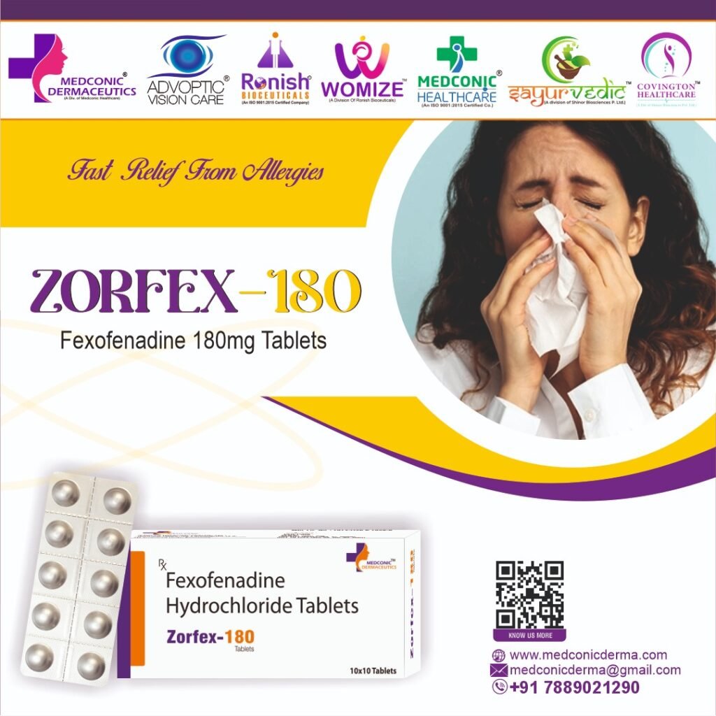 Our trusted product ZORFEX 180 – FEXOFENADINE 180MG TABLETS is widely prescribed for allergy management. If you are searching for a reliable PCD pharma franchise company for fexofenadine 180mg tablets, we provide complete support, quality assurance, and promotional tools to help you build your distribution network successfully.